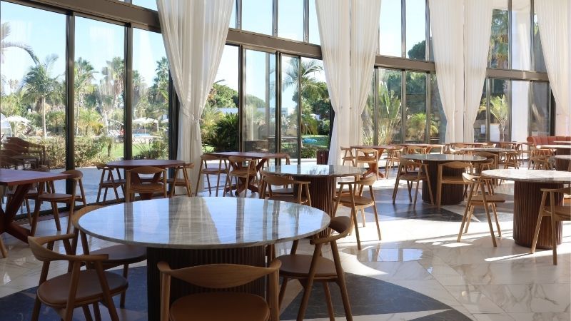 Genießen Sie die besten Buffets im Prestige Restaurant und auf der herrlichen Außenterrasse mit Blick auf die wunderschönen Gärten des Alfagar Prestige.
